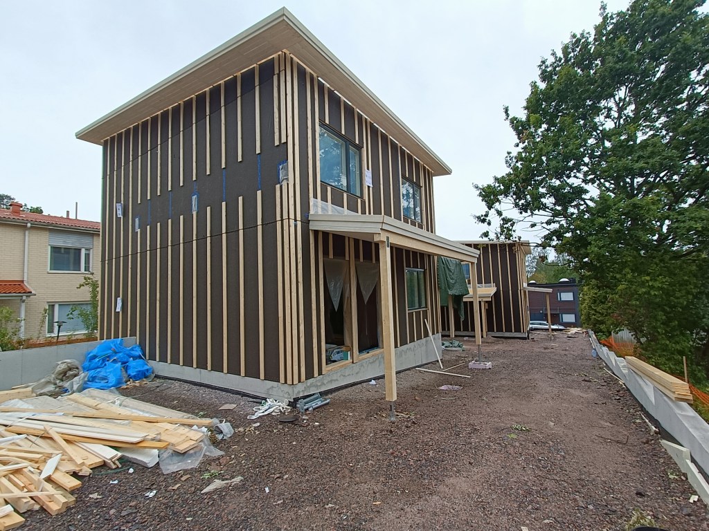 The detached house project in Espoo is presently under design consulting and construction supervision. The exterior envelope has been completed, and full project completion is anticipated by the end of 2025.