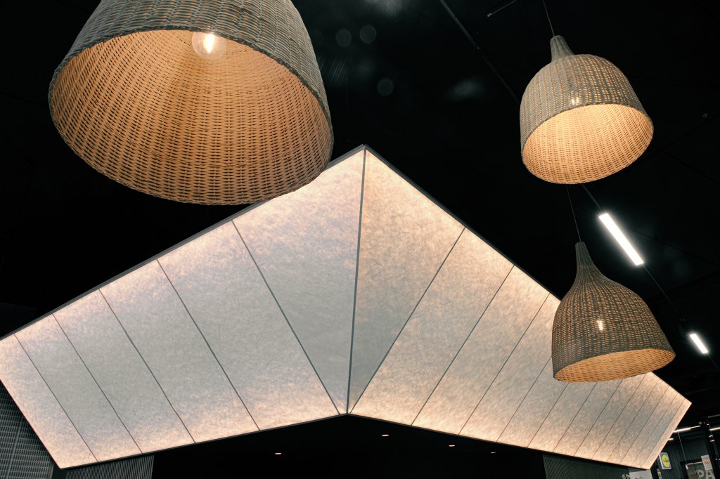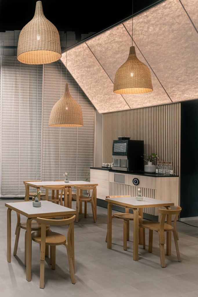 Rattan lamps are arranged along the main passage in the store, from the main entrance to the end area of the store, where the café and tea area are located. The important junctions and areas along the passage are enhanced by placing larger size lamps. Rattan lamps and Tyvek light installation are the two main design elements in the store. Besides the decorative purpose, they also respectively serve as guides for sightlines and pathways, and as markers for functional area identification. The café and tea area within the store is located close to the service counter and the windows facing the street. The back wall in the area is fully covered with 3 big fabrics hanging from the ceiling, with the 2-meter-high radiators hidden behind them. The Finnish-style furniture and decorations within this area harmonize with the overall style of the store, while also reminding people of the space where they are in.