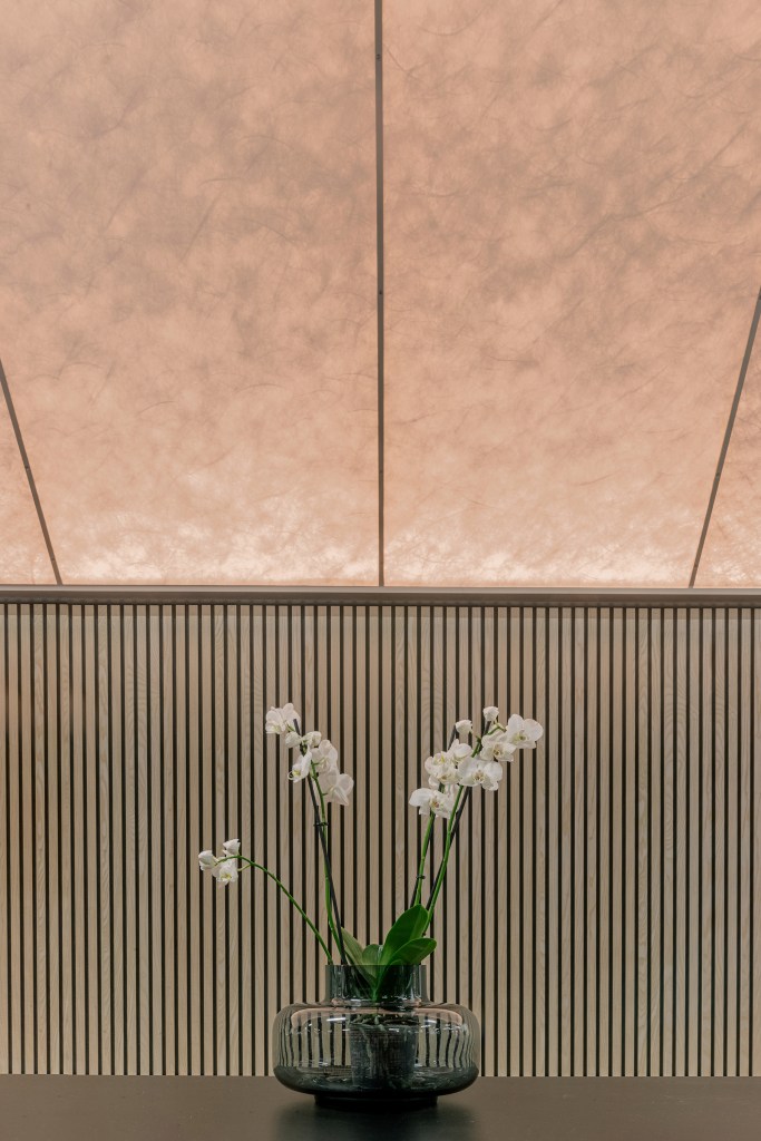 The design concept of the store is to create an “In shop” within the shopping mall. The tilted lighting installation with Tyvek material located above the cashier and service desk is a major element for the concept – an abstract expression of the sloping eaves found in traditional Asian architecture. The Tyvek 1073D non-woven material is attached to wooden frame, and covered by aluminum strips. The simplicity clean and the paper-like texture of the Tyvek material, together with careful and restrained design details interpretate the elegance of the Nordic and Asian at the same time, and adapt to the positioning of the store.